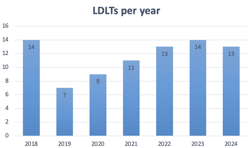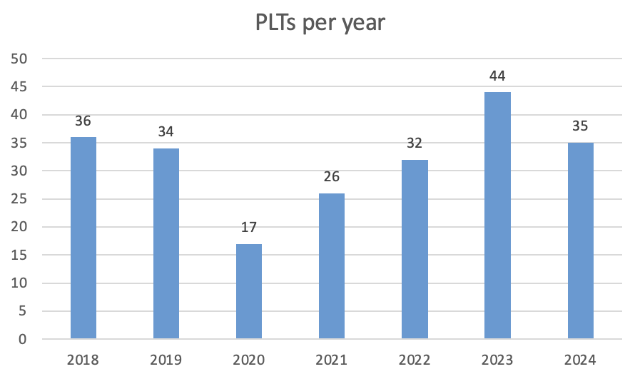 Between 2018 and 2024, a total of 1473 livers were transplanted, 224 PLTs, and 81 LDLTs. The majority took place in Mexico City (52.7%), followed by Jalisco (25.0%) and Nuevo León (17.0%), with only 5.4% conducted in other states. The average age of transplant recipients was 4.65 years, with a higher proportion of female patients (60.7%) compared to males (39.3%). Public healthcare institutions played a dominant role performing 82.6% of all PLTs, followed by private hospitals (17.4%), DDLT accounted for 63.8% of procedures while LDLT made up 36.2%. Blood type O was the most common among recipients (64.3%), followed by A (21.4%), B (10.7%), and AB (0.9%). The average of PLTs has remained stable (32 per year), except for a significant decline in 2020 (17) due to the COVID-19 pandemic, after which transplant activity recovered to pre-pandemic levels. The proportion of LDLT has also remained consistent, averaging 12 per year and representing 38% of total PLTs.