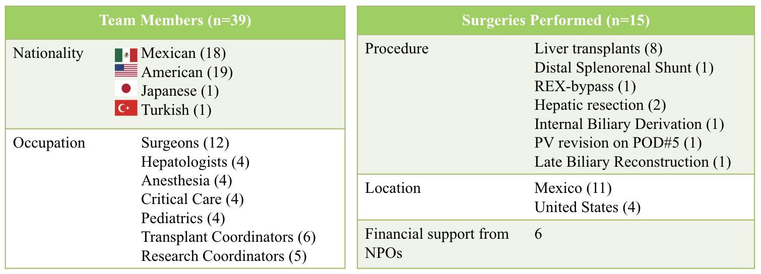 This is a retrospective observational study. We collected data from May 2017 to February 2025, including demographics, diagnosis, surgeries performed, and location. Surgeries were done in Mexico and the US. Our multidisciplinary team included surgeons, hepatologists, anesthesia, critical care, pediatrics, and coordinators, collaborating with Mexican transplant healthcare professionals. Educational, preoperative, surgical, and postoperative care protocols were developed by our team.
