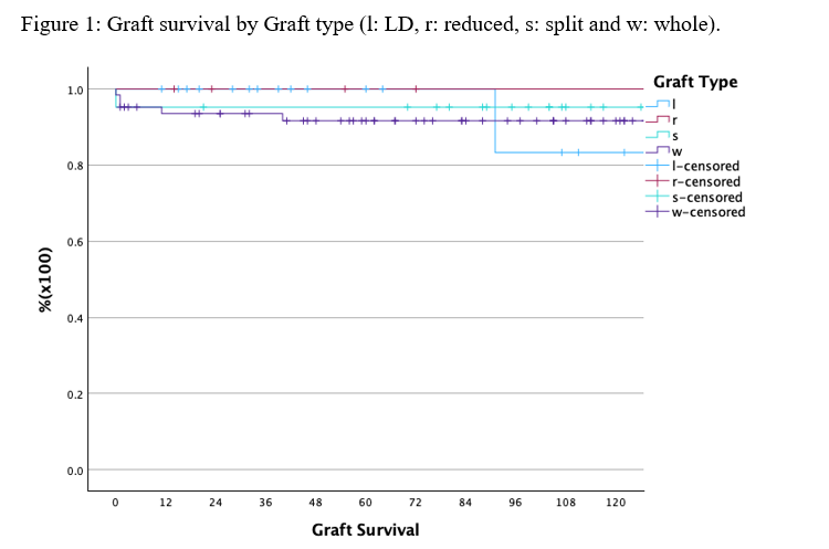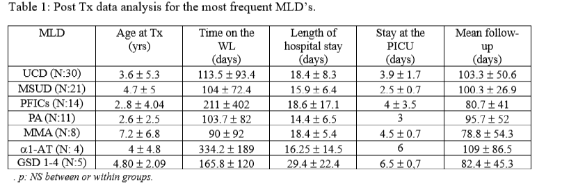 Results: 109/353 (31%) pediatric LT performed at our institution were for MLDs including: UCD: 30, MSUD: 21, PFICs’: 14, PA: 11, MMA: 8, a1-AT: 4, GSD: 5, others:16. The mean age at LT 4.27 ± 5.09 years, mean time on the waiting list: 126.4 ± 168.4 days; the analysis of the most frequent MLDs’ results are shown in table 1. Sixty-three (58%) received whole organs, 21 (19%) Splits, 18 Living donors (16%) and 7 reduce grafts. Three patients died (2.7%), and other 4 grafts were lost. The overall Patient survival was: 99% 1st year, 98% at 3rd and 5th years, while Graft survival was: 95% 1st year, 95% 3rd year and 94% 5th year. Patient and Graft survival analysis by primary disease and graft types were not different among the prevalent diseases.