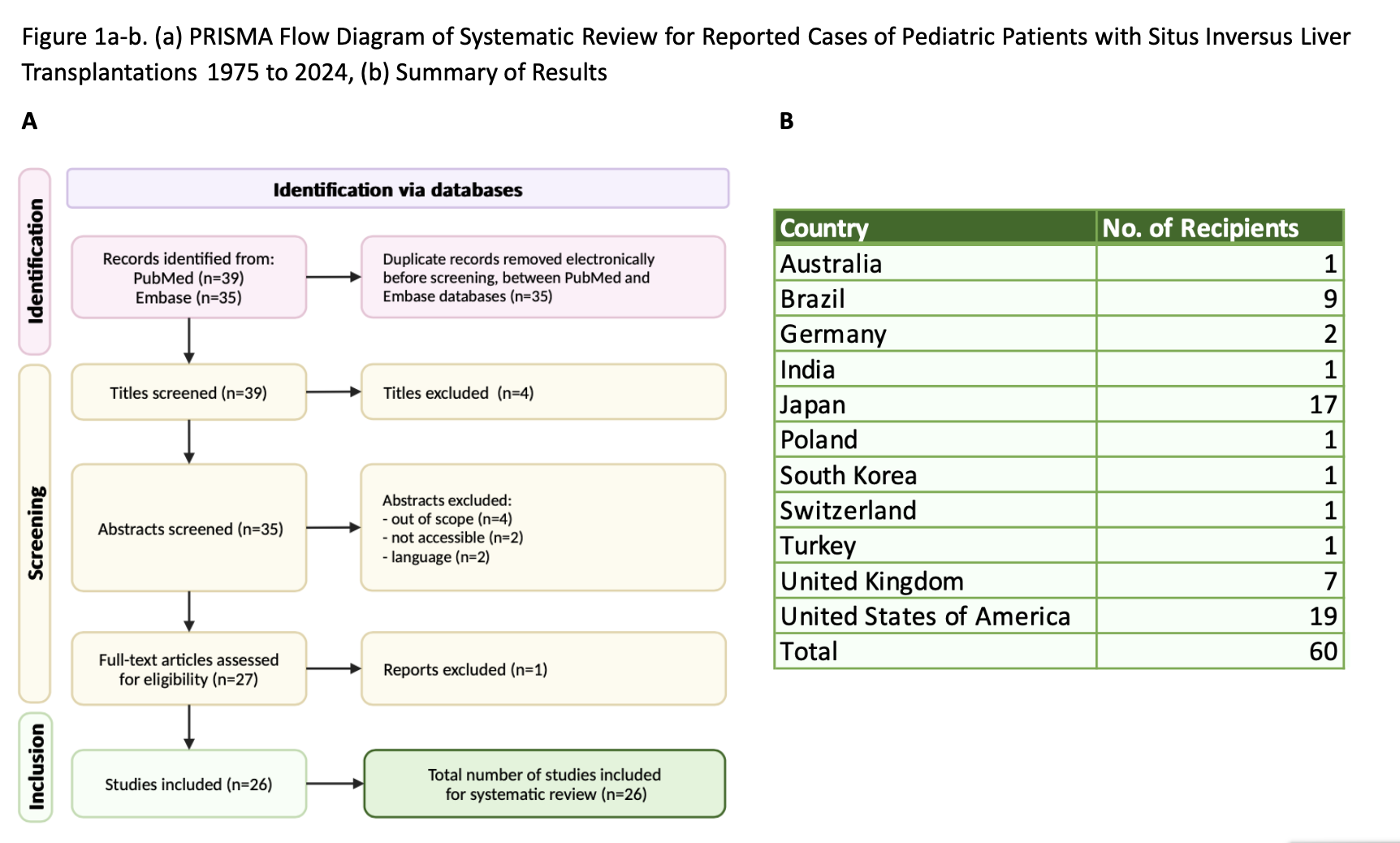 Patient and Methods: A 6-month-old female weighing 8 kg with an uncomplicated birth history developed cholestasis at 10 days of life. Imaging revealed SI abdominalis, biliary atresia, polysplenia, levocardia, and absence of inferior vena cava. Subsequently, she underwent exploratory laparotomy with a Kasai procedure and Meckel's diverticulectomy. The Kasai failed, leading to decompensated liver disease. She then underwent living-donor left-lateral lobe LT. In addition, a systematic review of the literature was conducted: flow diagram in Figure 1a.