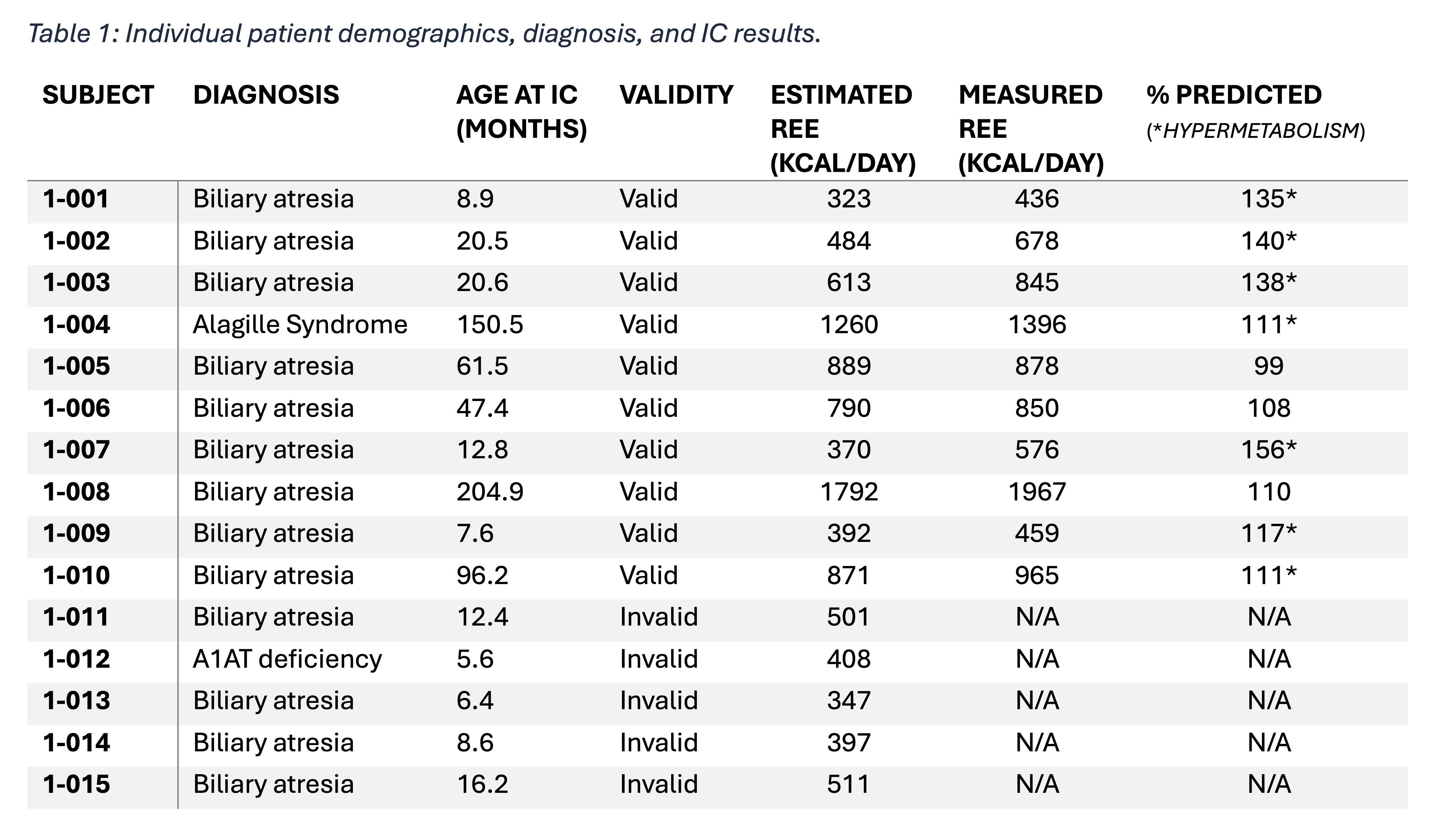 Results: 15 pre-transplant patients underwent IC at median age of 16 months (range 5-205). IC was valid in 67% patients (10/15). Invalid IC was due to inability to reach steady state in 5/5 patients. Of patients with valid studies, 70% were hypermetabolic. 50% of patients had an increase in recommended calories based on mREE. Of those who had post-transplant mortality (3/15), 2/3 were hypermetabolic and 1/3 had an invalid study.