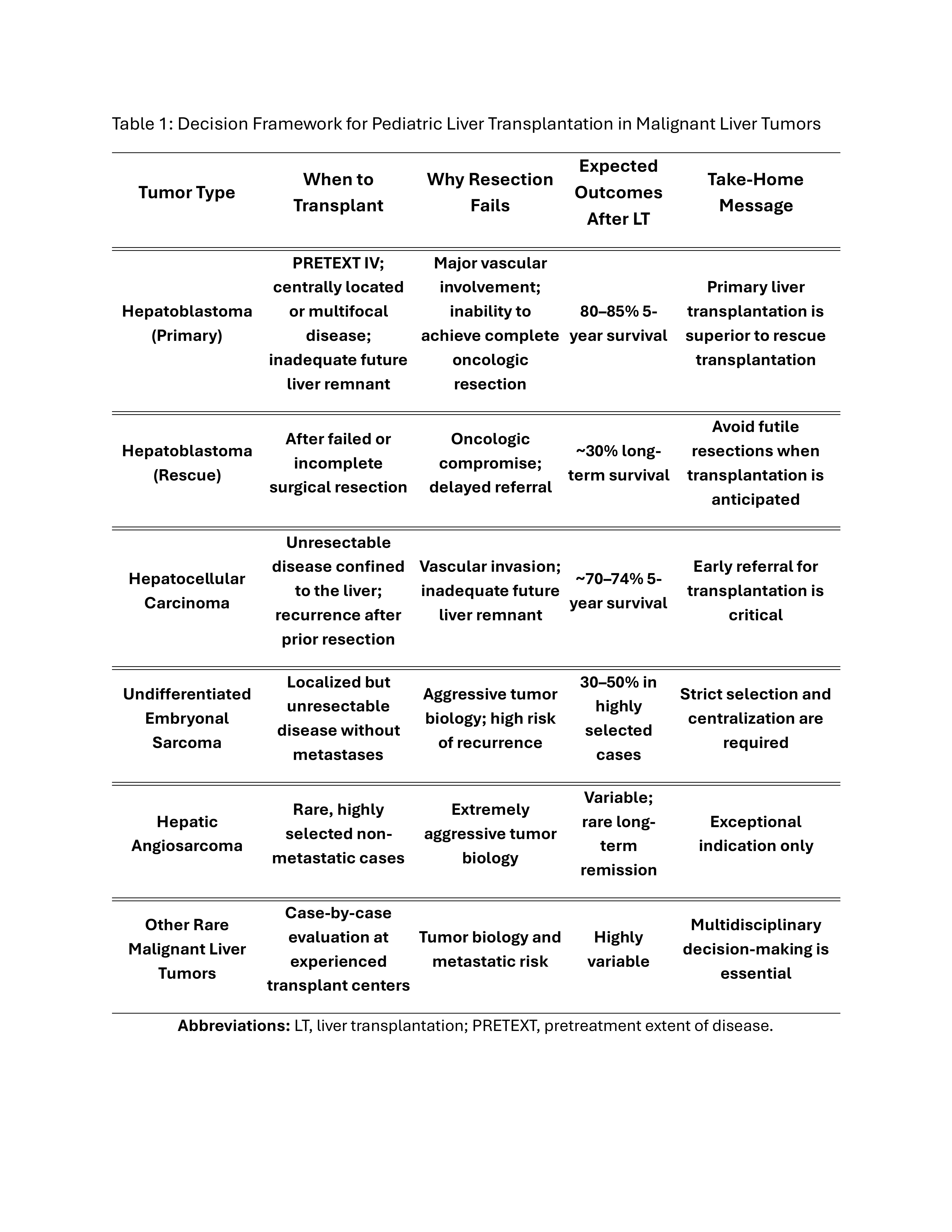 Method: A structured literature review was performed to evaluate outcomes of pediatric LT for hepatoblastoma (HB), hepatocellular carcinoma (HCC), and rare malignant liver tumors. Emphasis was placed on transplant-specific decision factors, including resectability, timing of listing, recurrence, and survival.