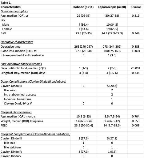 Eleven robotic and 30 laparoscopic LLS were performed. Donor and recipient characteristics were found to be similar between the groups (Table 1). The median operative time was 273 minutes for laparoscopy vs. 265 minutes for robotic (p=0.888). Robotic LLS was associated with less blood loss than laparoscopic (median 27.5ml vs 100ml, p<0.001) and no transfusions were required in the robotic group. There were no conversions to open in either group.
