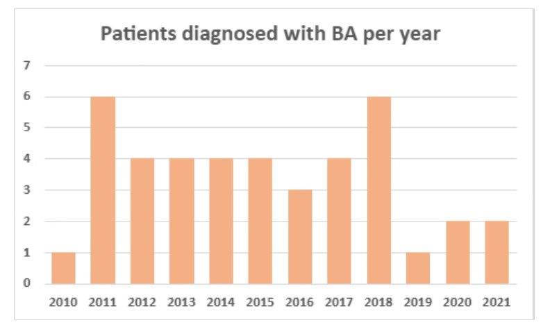 Between 1 and 6 patients per year were diagnosed with BA for a total of 41 and an average of 3.4. Average incidence is 5.03 in 100,000 or 1 in 19,899 live births with 1,4:1 female:male ratio.