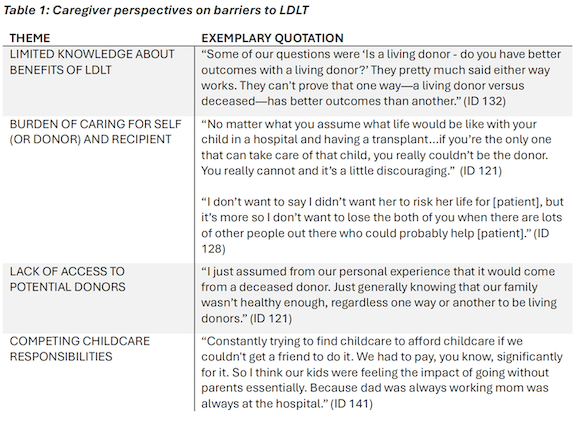 Conclusion: No caregivers opposed LDLT for their child. Interventions that increase awareness of the benefits of LDLT early in the evaluation process, connect families to non-directed donors, and support caregivers find resources for childcare throughout the transplant journey may improve uptake of LDLT. Such efforts should prioritize under-resourced families to enhance equitable access and outcomes for pediatric liver transplant recipients.