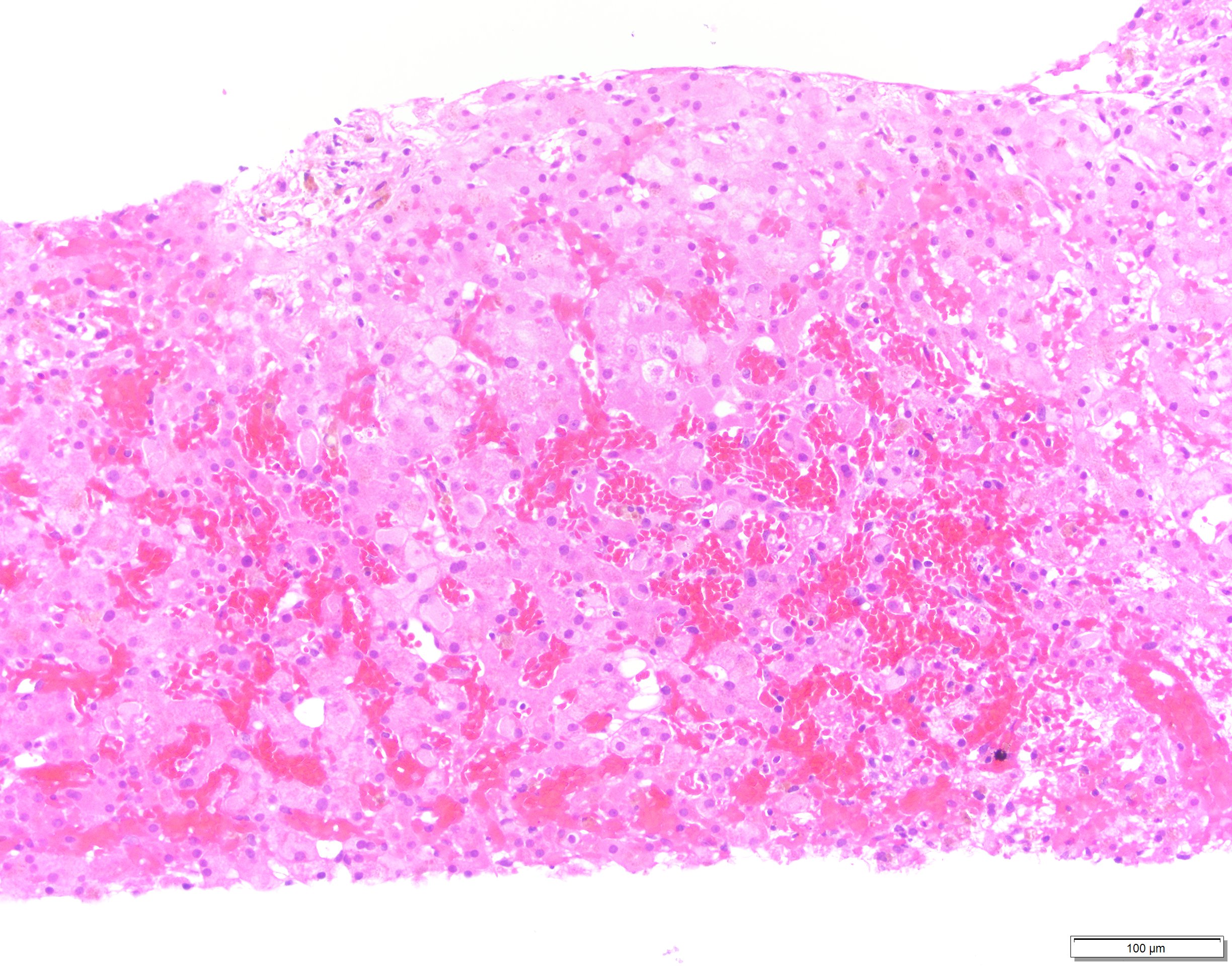 Case presentation: A 5-year-old male transplanted for PRETEXT-III hepatoblastoma however with explant showing >99% hepatocellular carcinoma developed recurrent disease in the transplanted liver. He received two sessions of Y-90 RE. One month later, he developed ascites. MRI demonstrated persistent hepatic lesions, heterogeneous parenchymal enhancement, patent vessels, and large-volume ascites. A liver biopsy for abnormal liver chemistries (AST 533/ALT 274, Tbili 1.1/Dbili 0.6, INR 2.3) demonstrated diffuse sinusoidal dilatation resembling VOD with no evidence of rejection. Ascitic fluid studies were consistent with portal hypertension without evidence of malignancy. He received defibrotide for 18 days with improved liver tests, ascites, and coagulopathy. Tbili/Dbili peaked at 2.7/1.2. Labs continued to improve: AST 57/ALT 32, Tbili 1.5/Dbili 0.6, INR 1.1. One month later, he remains stable without recurrence of REILD.
