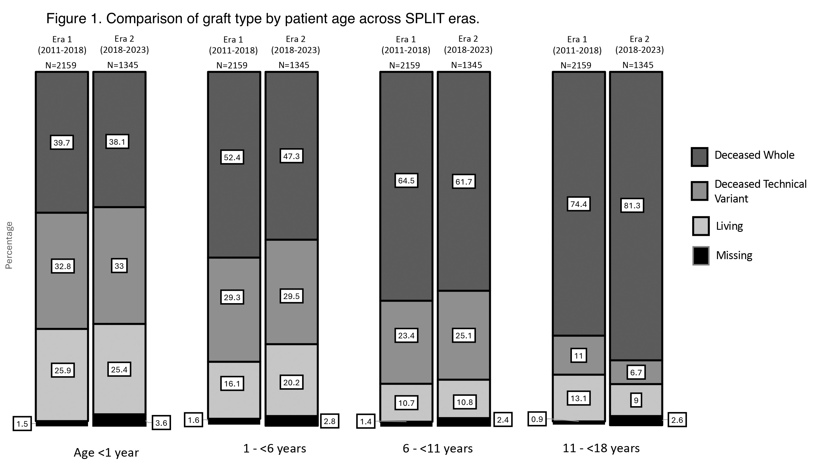 Methods: Patients <18 years with first-time LT only enrolled into the SPLIT Registry between 2011-2023 were included. Data was stratified into eras from last published registry update (era 1: 2011-2018, era 2: 2018-2023).