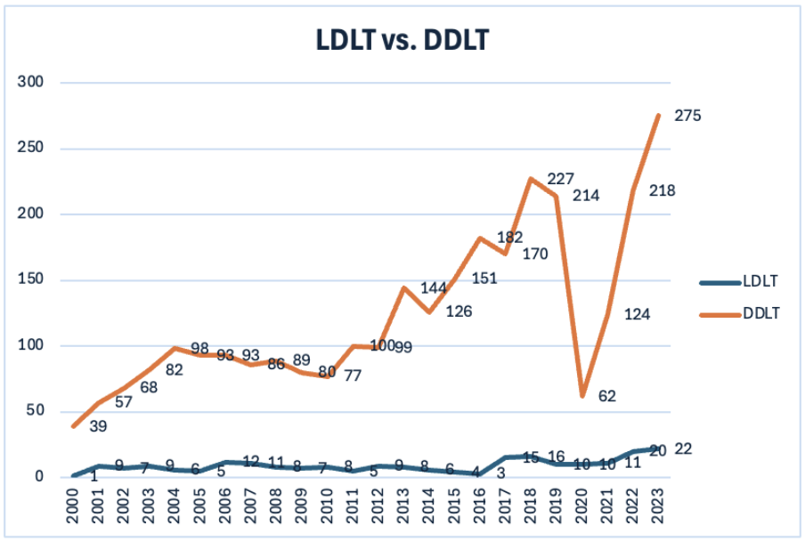 In Mexico, between 2000 and 2023 a total of 3,176 liver transplants were performed. 2,954 DDLT (93%) and 222 LDLT (7%). A statistically significant difference between DDLT and LDLT was observed (p<0.0001). The median annual LDLT was 8.5 (95% CI: 6–11), in contrast with DDLT which was 98.5 (95% CI: 80.5–162).