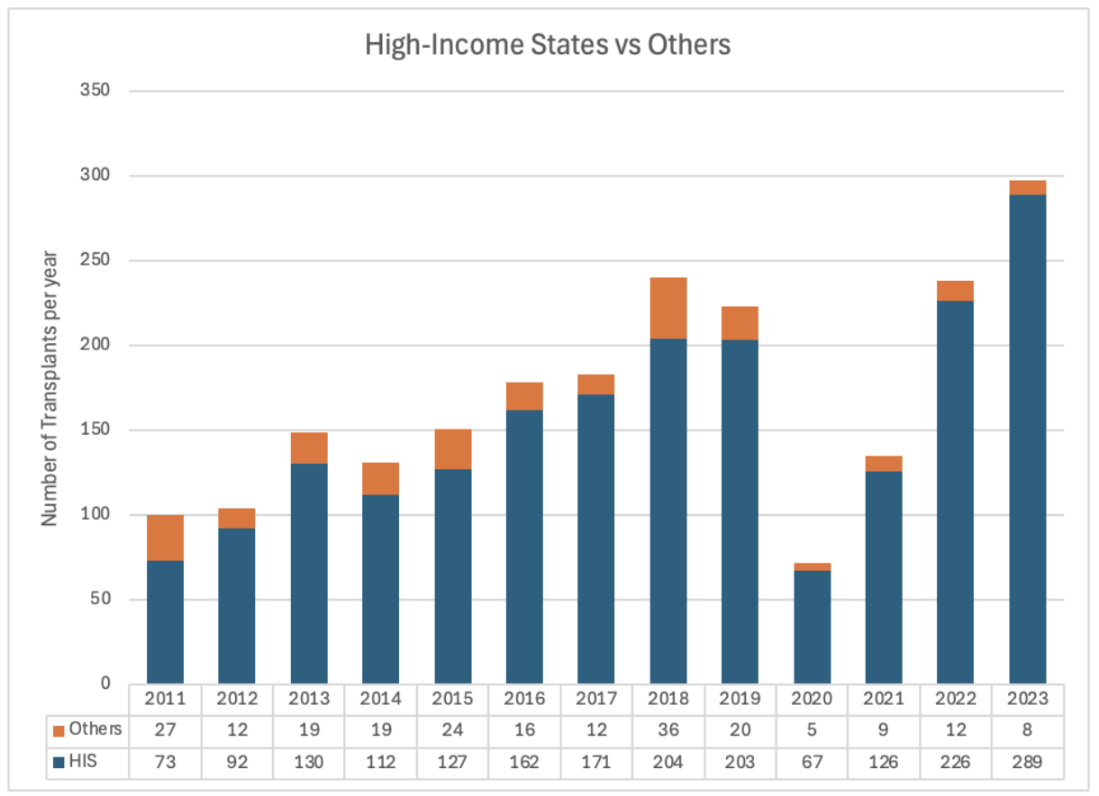 METHODS: We performed a retrospective observational study collecting data from Mexico's National Transplant Registry (CENATRA). We gathered the liver transplants performed between 2011 and 2023 in the 32 federal Mexican entities. Transplants were classified into high-income state transplants (performed in Mexico City, Jalisco, and Nuevo León) and transplants performed in the other 29 states. A Mann-Whitney U test was used to compare these two groups, with statistical significance defined as p<0.05.