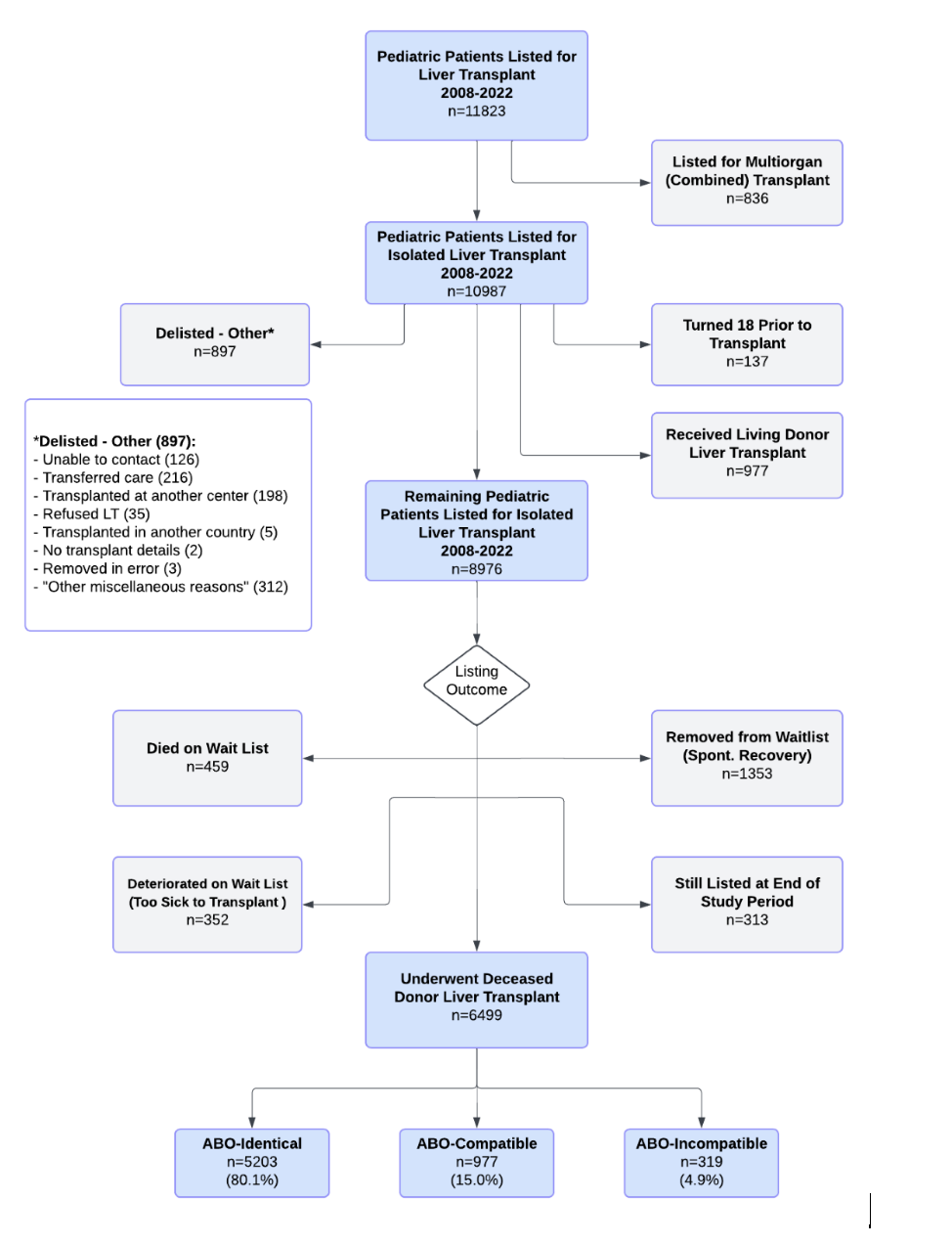 Methods: We retrospectively analyzed the UNOS database for pediatric LT candidates (<18 years) listed for deceased donor liver-only transplant (DDLT) from January 2008 to December 2022. Patients were categorized by blood type and by ABO-identical, ABO-compatible, or ABO-incompatible LT. Specifically, we analyzed the impact of candidate-donor blood matching, including ABO non-identical LT, on outcomes.