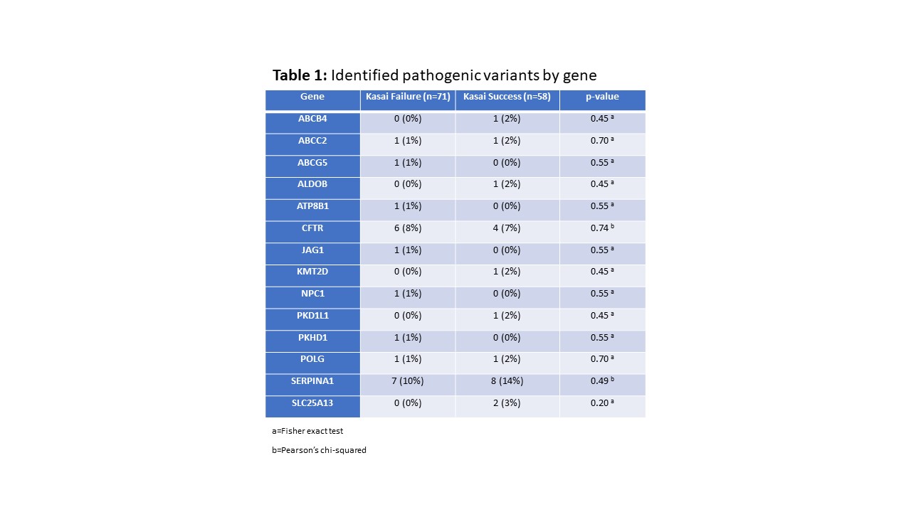 Method: Individuals with BA were dichotomized into KPE failure (KF; LT listing prior to age 2 years) and success (KS; LT listing after age 2 years), representing persistent cholestasis post-KPE and non-cholestatic complications, respectively. Genetic evaluation of 77 genes associated with Mendelian cholestatic disorders was performed on liver tissue and blood specimens, previously saved in IRB approved biorepositories. The incidence of pathogenic genetic variants was compared between groups.