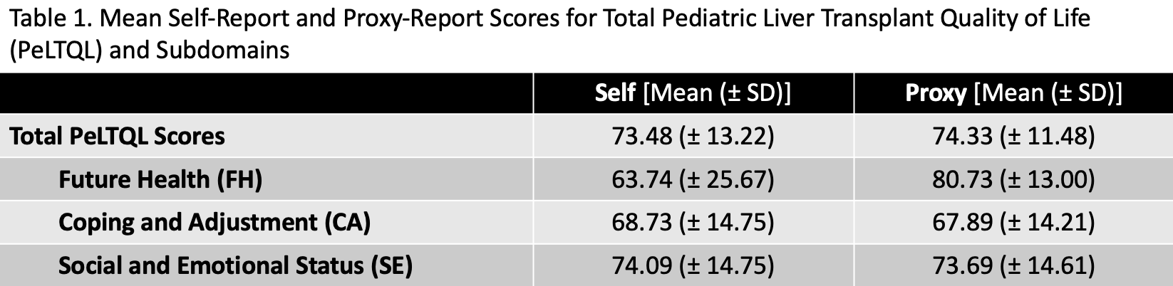 Methods: Between 2022 and 2024, pediatric liver transplant recipients aged 8–17 years, at least one-year post-transplant, completed the PeLTQL questionnaire as part of standard clinical care. Both self-reports (patients) and proxy-reports (caregivers) were reviewed with the patient and family, with resources provided as needed.